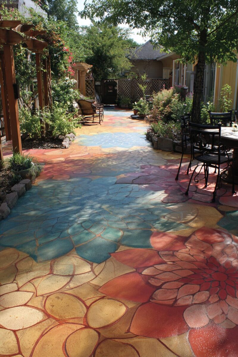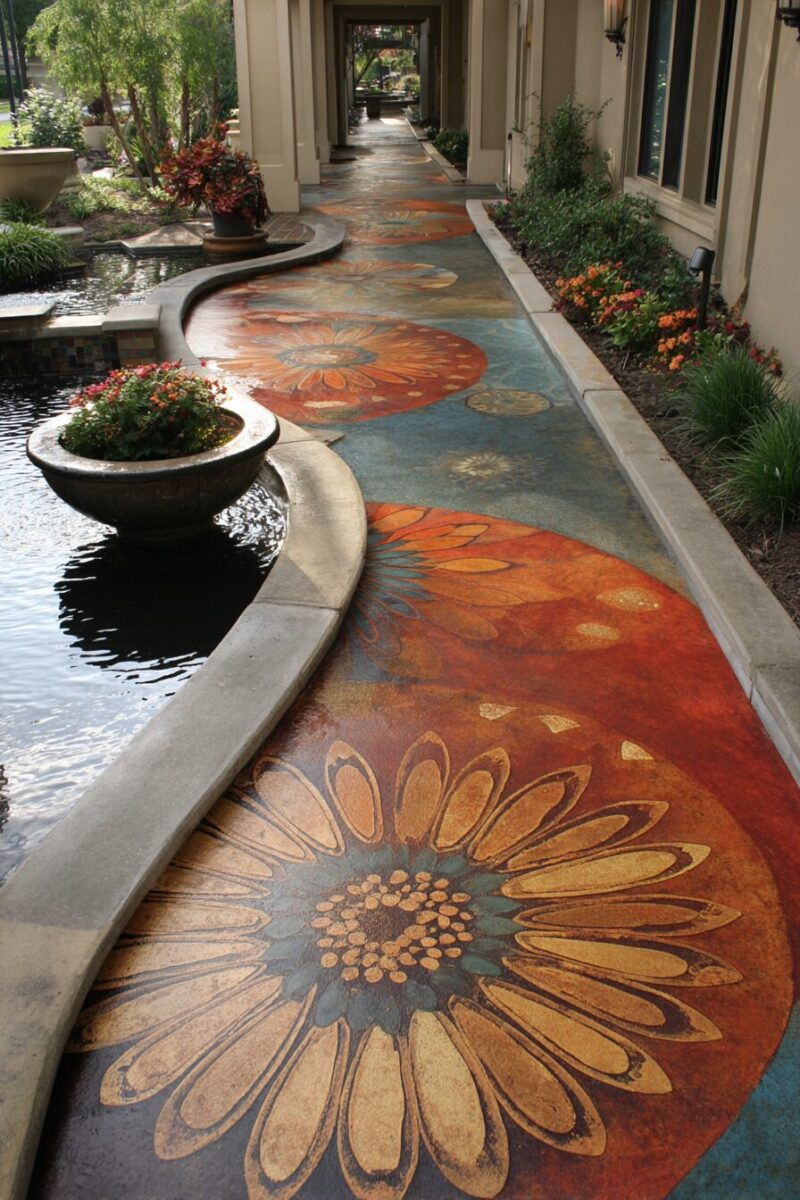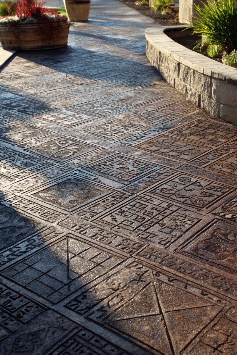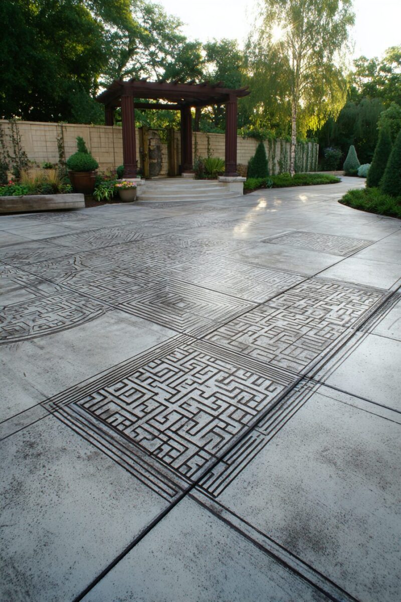 This technique transforms plain concrete into a canvas for geometric patterns, borders, or even custom artwork.