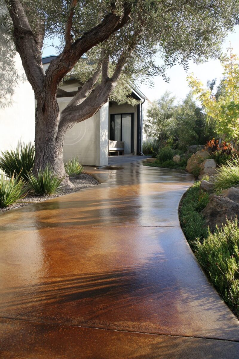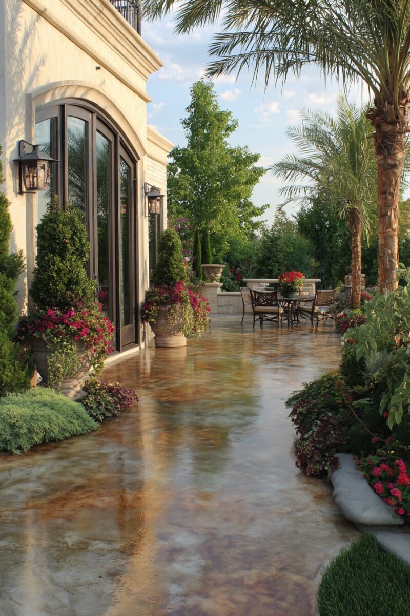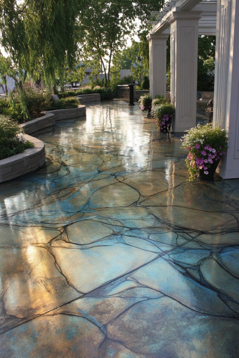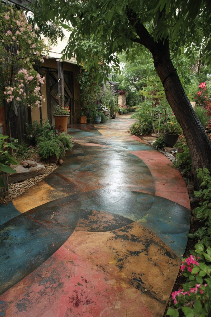 This technique transforms plain concrete into a canvas for geometric patterns, borders, or even custom artwork.