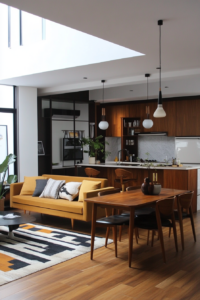A bold retro console sparks playful 70’s flair behind a modern sofa.