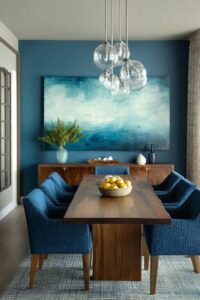 As a focal point or an accent, artwork instantly enlivens contemporary dining rooms.