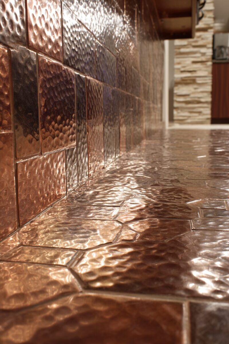 Hammered copper tiles bring an artisanal touch that makes your kitchen feel like a high-end restaurant.