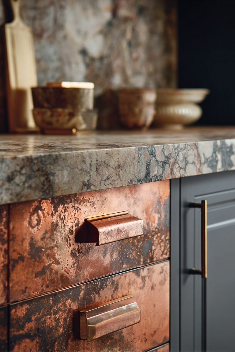 The historical associations of patina copper add gravitas and sophistication to contemporary kitchen designs.