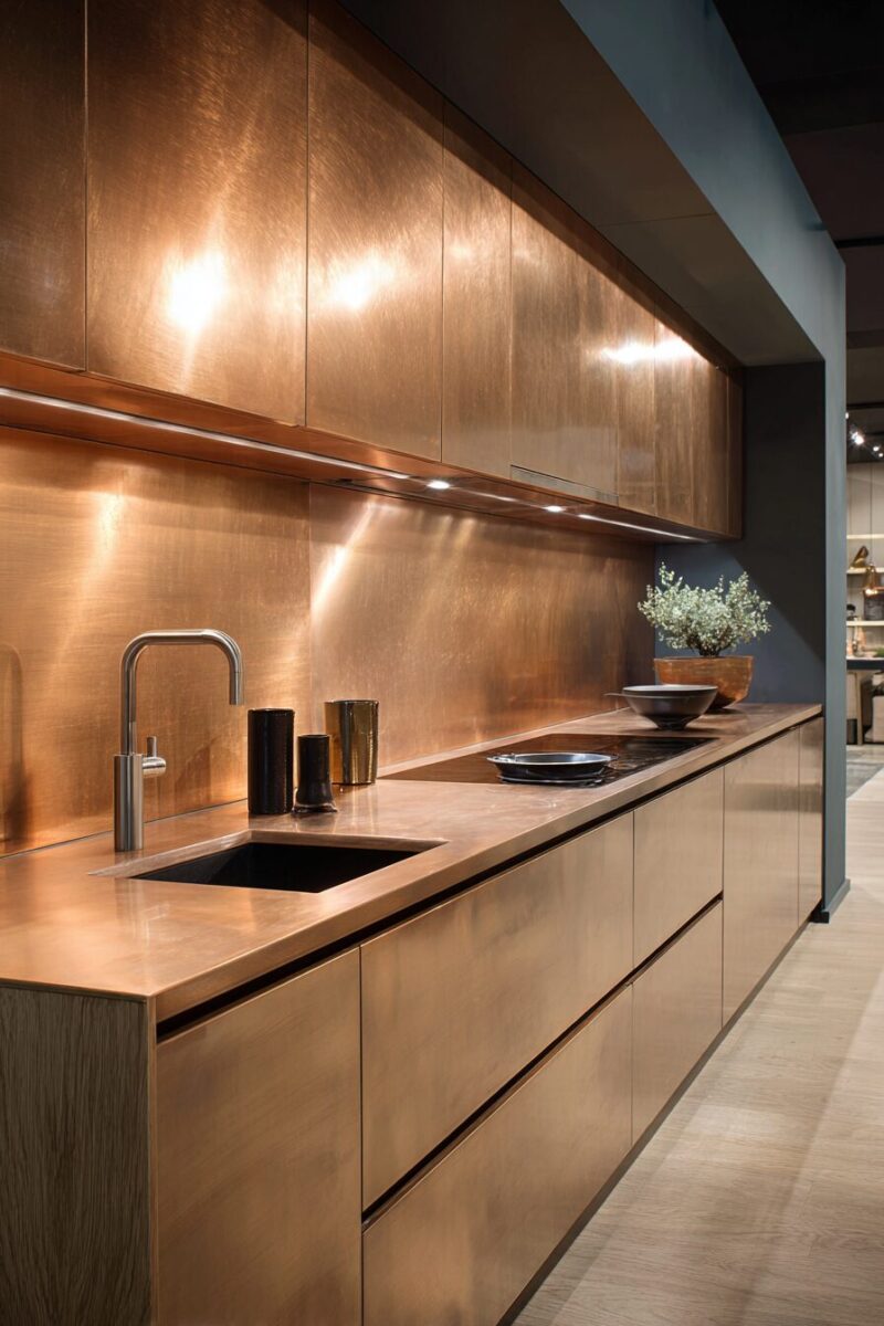 This style works particularly well when you want copper’s warmth without overwhelming pattern or texture.