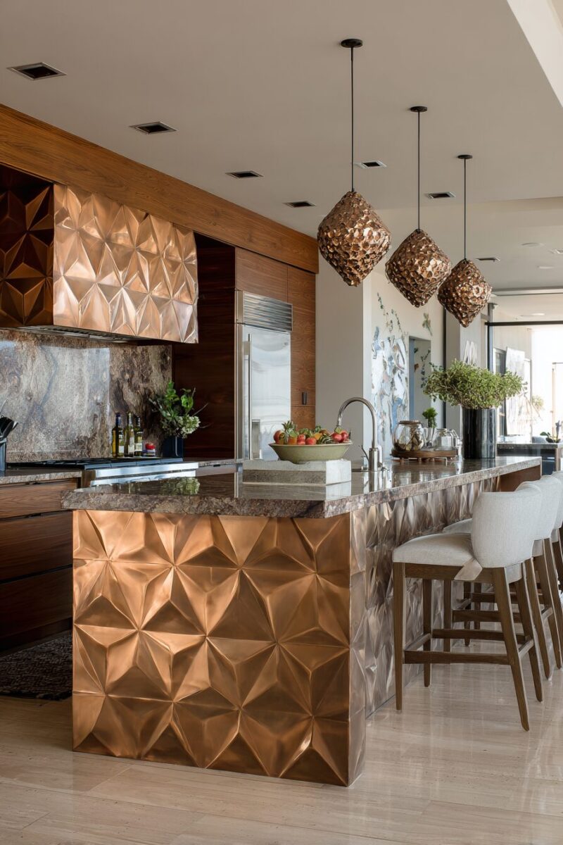 Copper with geometric patterns creates dynamic visual energy that transforms your kitchen into a design showcase.