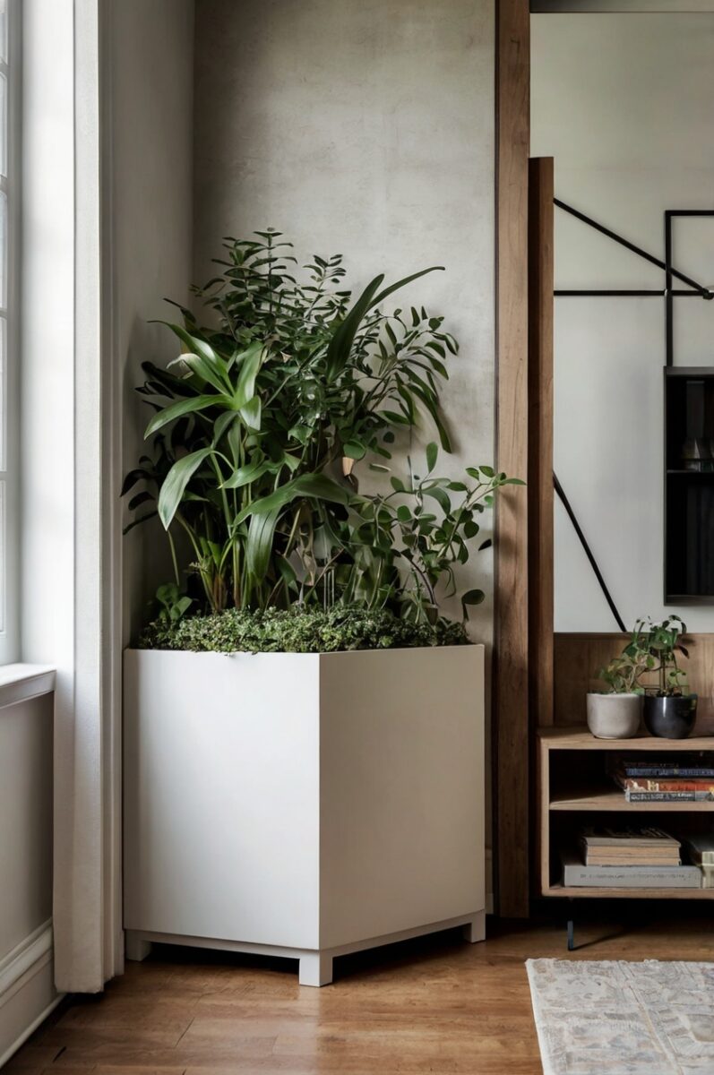 Custom-built corner planters with hidden storage compartments combine plant display with practical organization in the most stylish way imaginable.