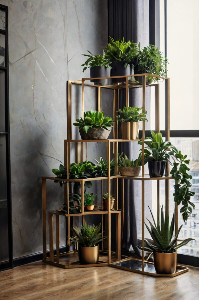 Geometric metal plant stands featuring triangular, hexagonal, or diamond-shaped frameworks create stunning visual interest while providing multiple display levels for your growing collection.