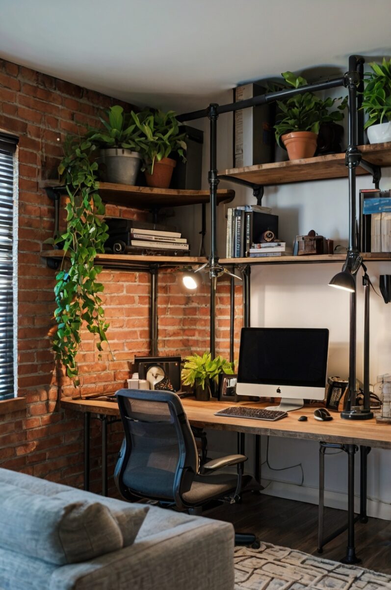 Nothing says “urban chic” quite like a corner plant stand built from black iron pipes that looks like it could double as modern sculpture.