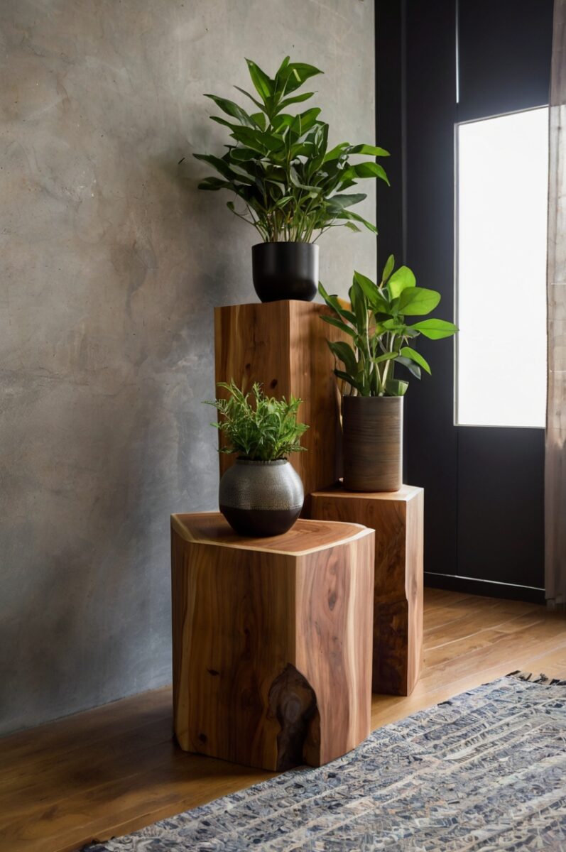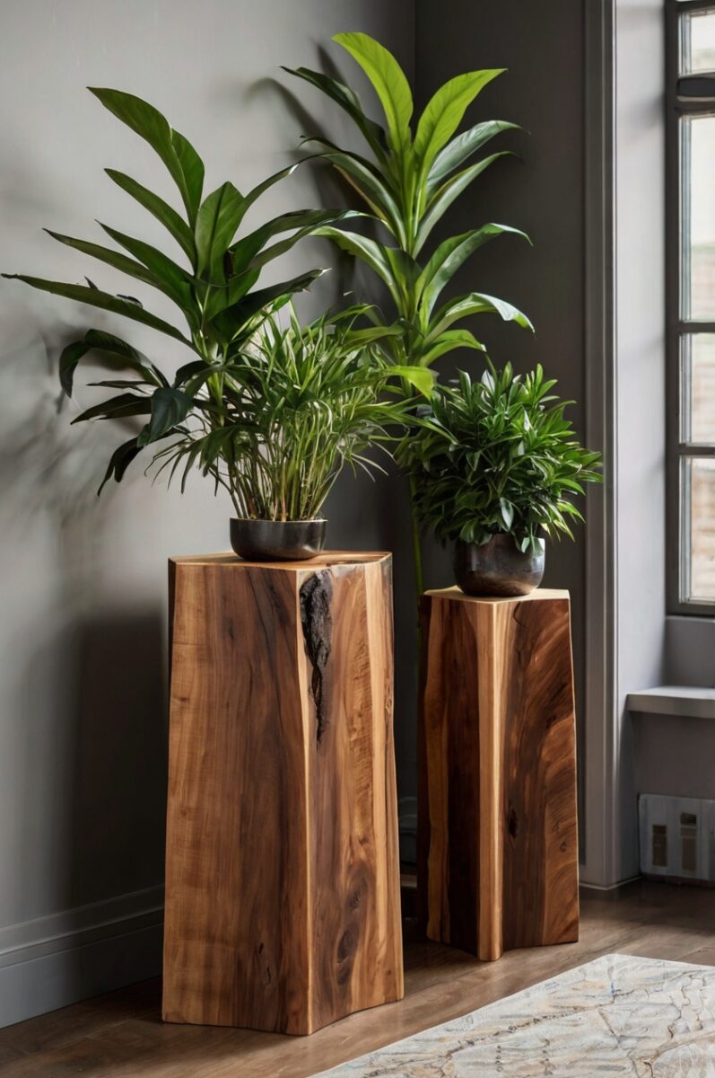 Raw-edge wooden plant stands bring the organic beauty of nature indoors while creating stunning focal points that celebrate both craftsmanship and natural form.