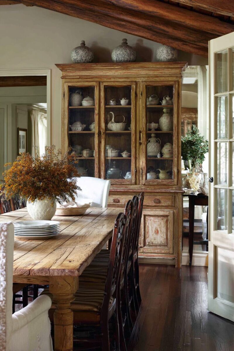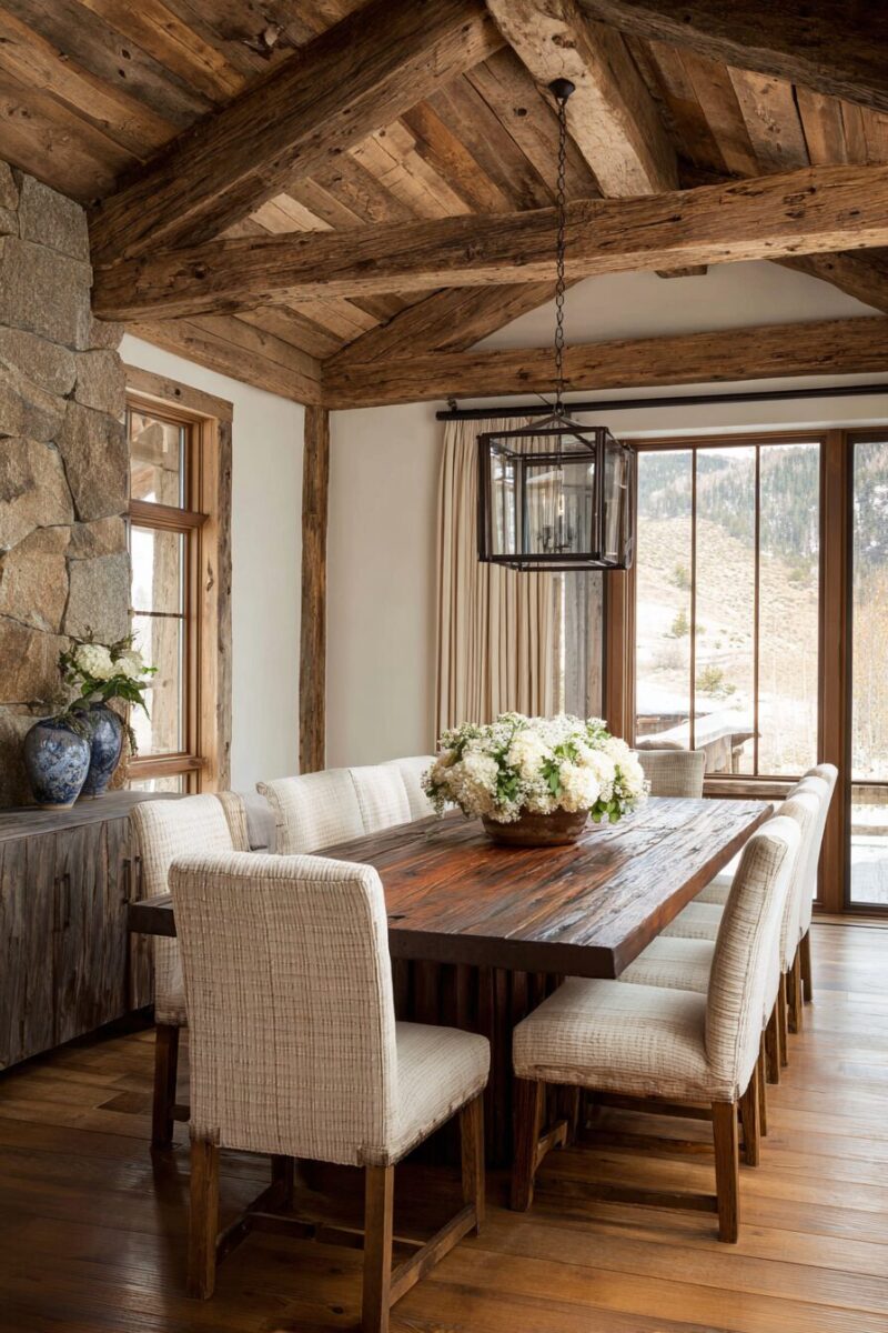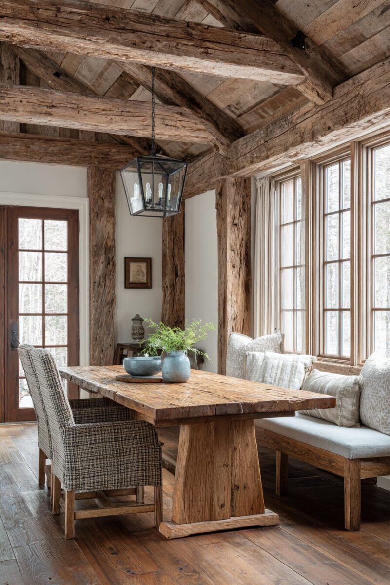 Exposed ceiling beams instantly transform any dining room into a cozy cottage retreat that feels both rustic and refined.