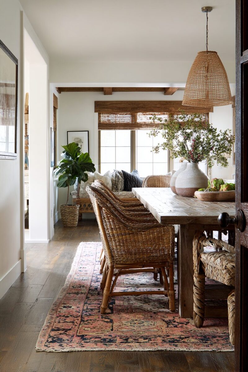 You can start with a larger, neutral base rug that defines your dining area, then add smaller vintage pieces on top for pattern and color.