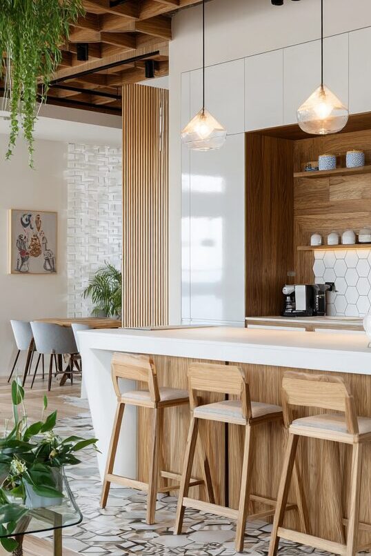 For unexpected texture, consider incorporating wicker, rattan or seagrass through counter stools, basket storage, or even pendant light fixtures that cast interesting shadow patterns across walls and floors.
