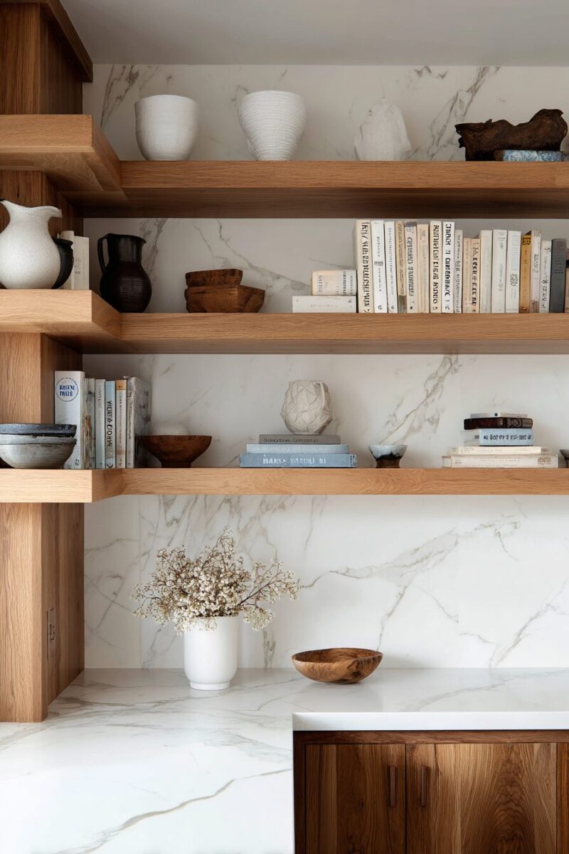 Seasonal adjustments keep your open shelving fresh and engaging—swap in preserved autumn leaves in small vases during fall or bright citrus fruits in wooden bowls during summer months.