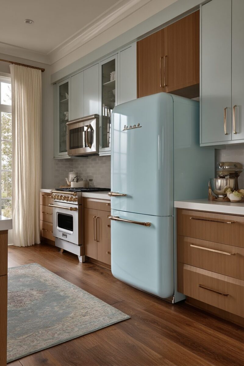 Look for refrigerators with curved corners and latching handles that mimic the iceboxes of the past while concealing modern features like water dispensers and smart technology.