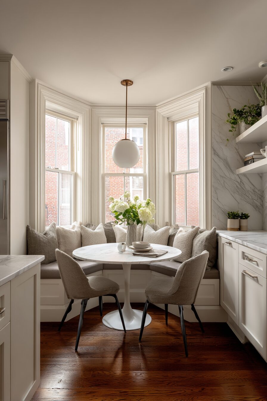 Lighting makes or breaks a breakfast nook—pendant fixtures hung low over the table create an intimate zone of illumination, while ensuring the light is warm rather than stark enhances that golden-hour feeling regardless of the time of day.