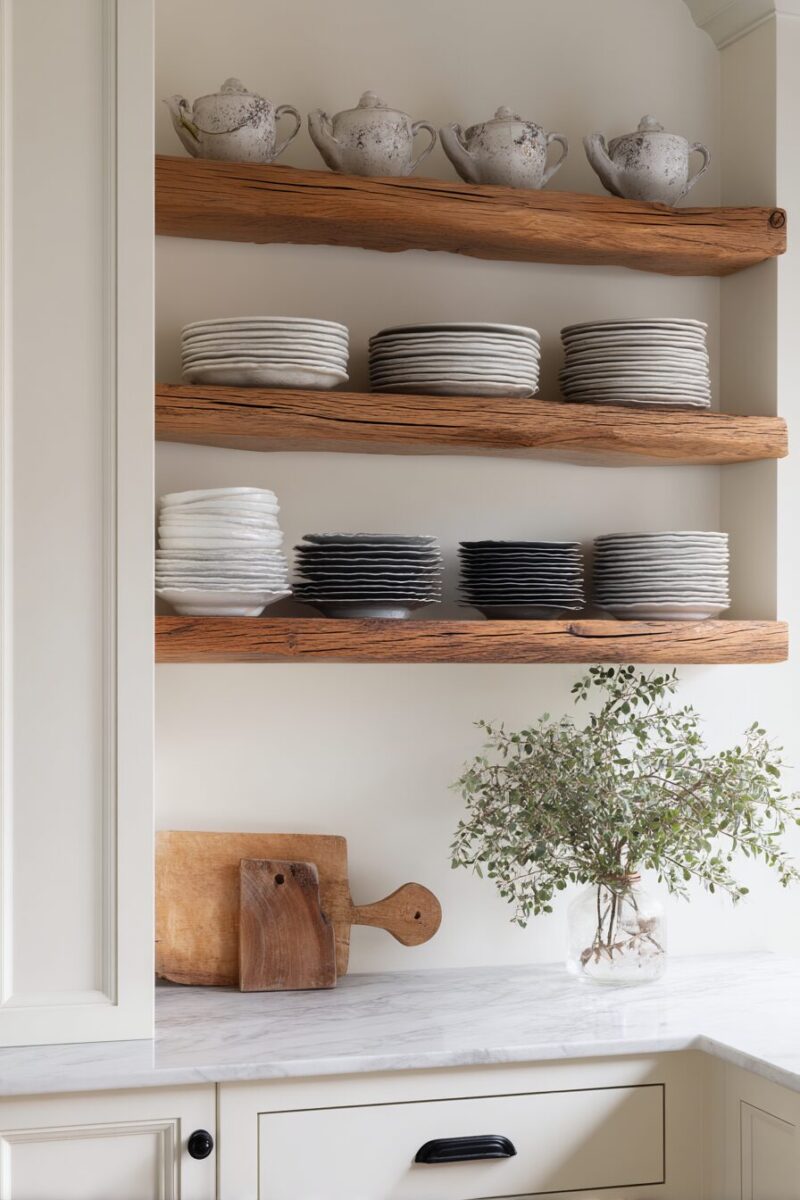 Begin with simple wooden shelves in natural finishes or painted in soft, heritage colors that complement your overall palette.