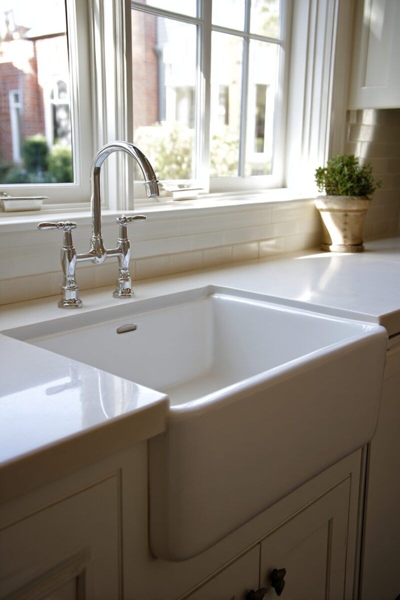 For authentic charm, consider a classic white fireclay sink with a fluted front that brings immediate character to your space.