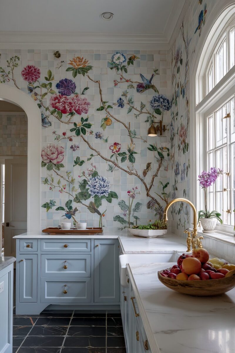Wallpaper makes a triumphant return in cottage kitchens—consider installing it on a single focal wall or within the panels of glass-front cabinets for impact without overwhelming your space.