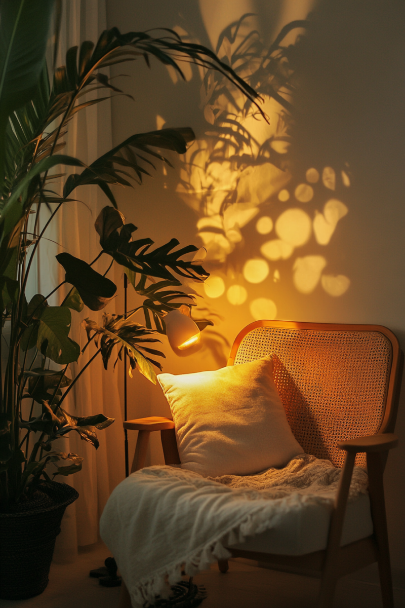 Lighting matters too—place a warm-toned lamp nearby to amplify the snugness.