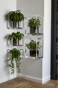 Hanging plants suspended in macramé or wire holders are great options if floor space is limited.