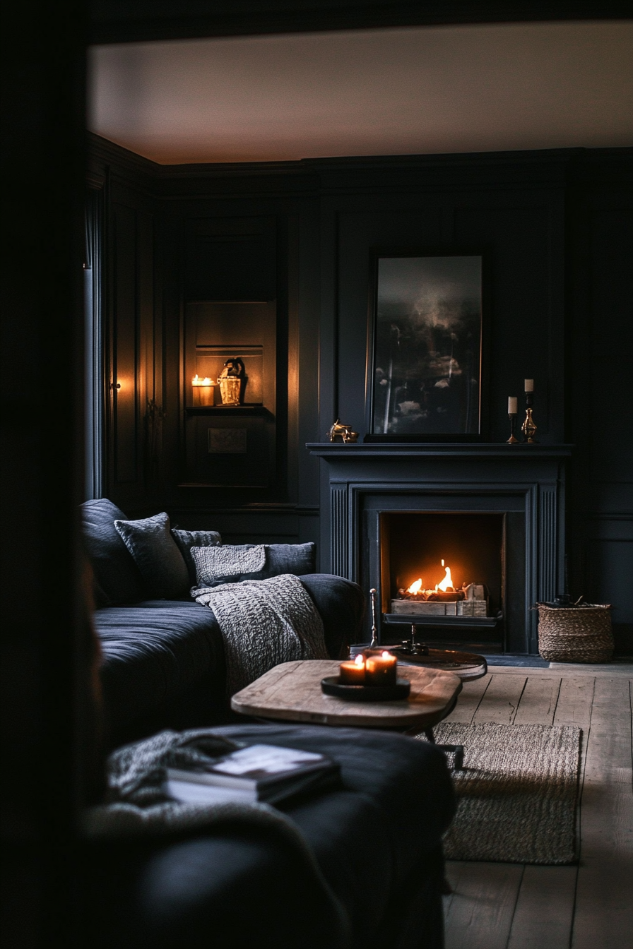 The textures and surfaces you choose can also enhance the dark, moody vibe of a living room.