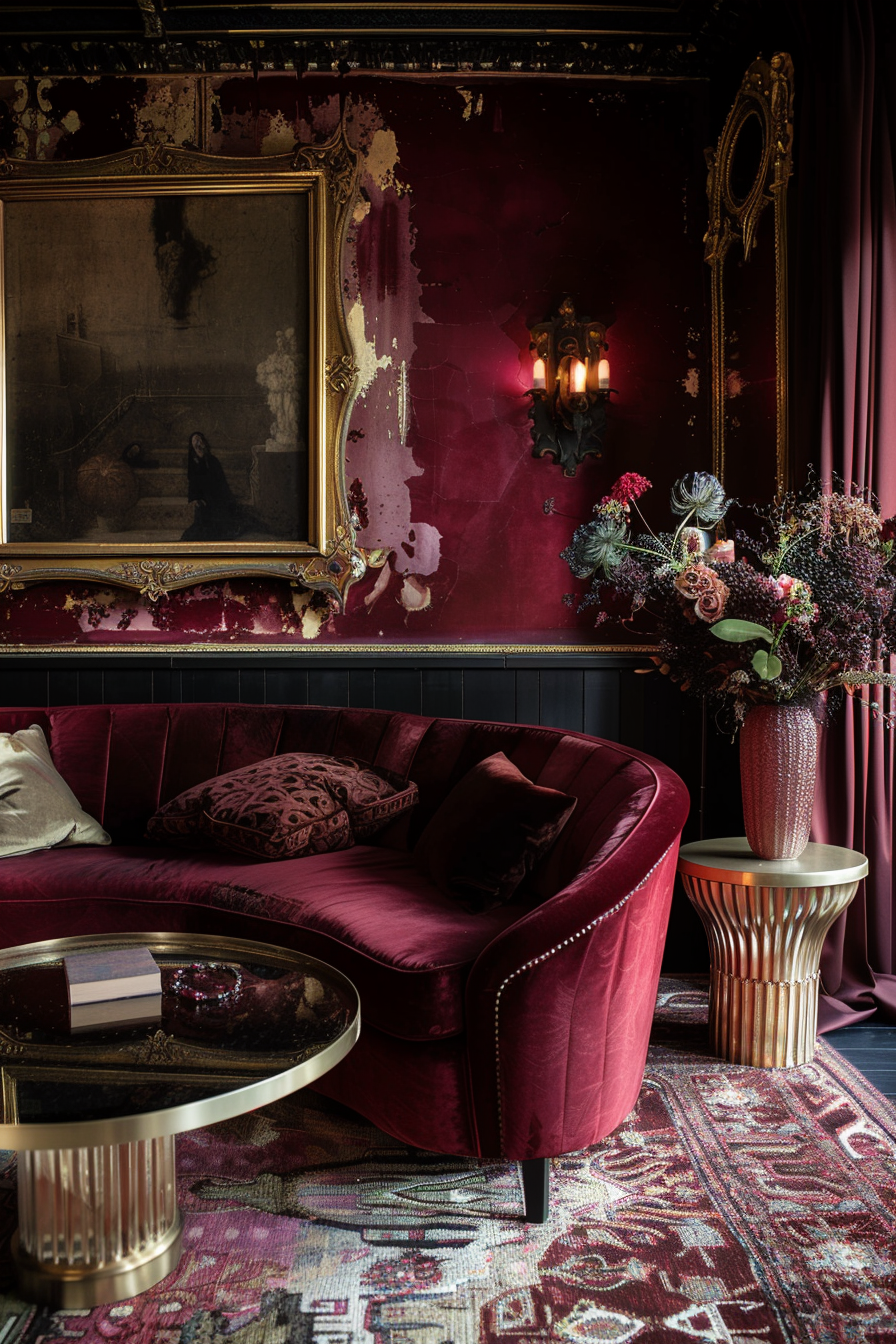 This glamorous living room features moody burgundy walls, ornate gilded mirrors and sleek furniture for a luxe Art Deco vibe.
