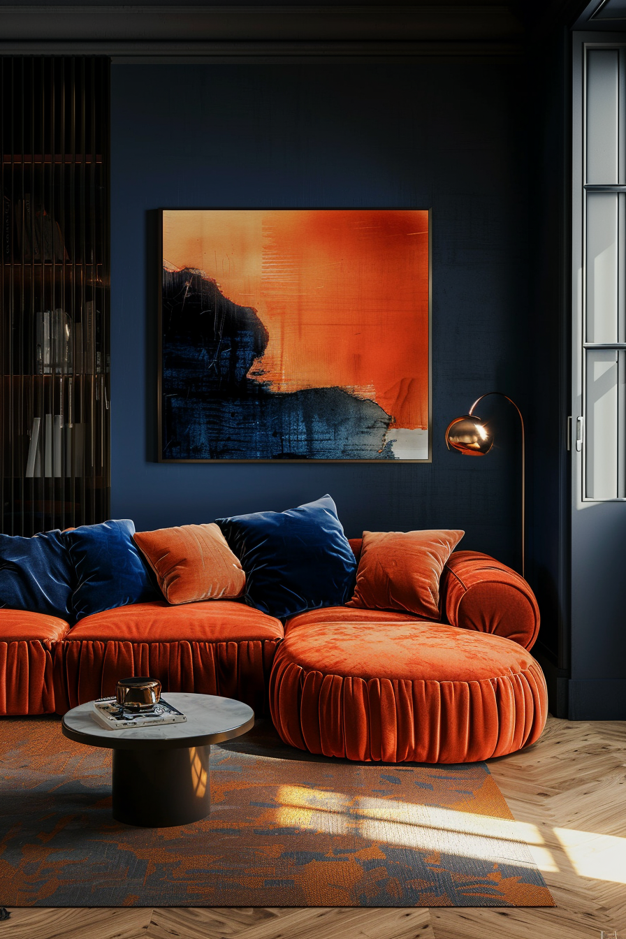 This living room pairs rich navy blue walls with terracotta orange accents for a bold and moody color palette.