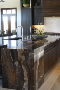 The stone’s earthy vibes offset the sleek metal and luxe cabinetry beautifully.
