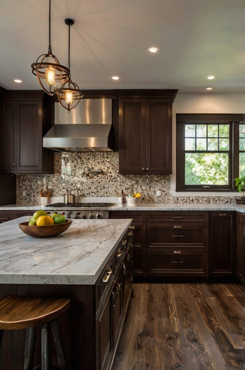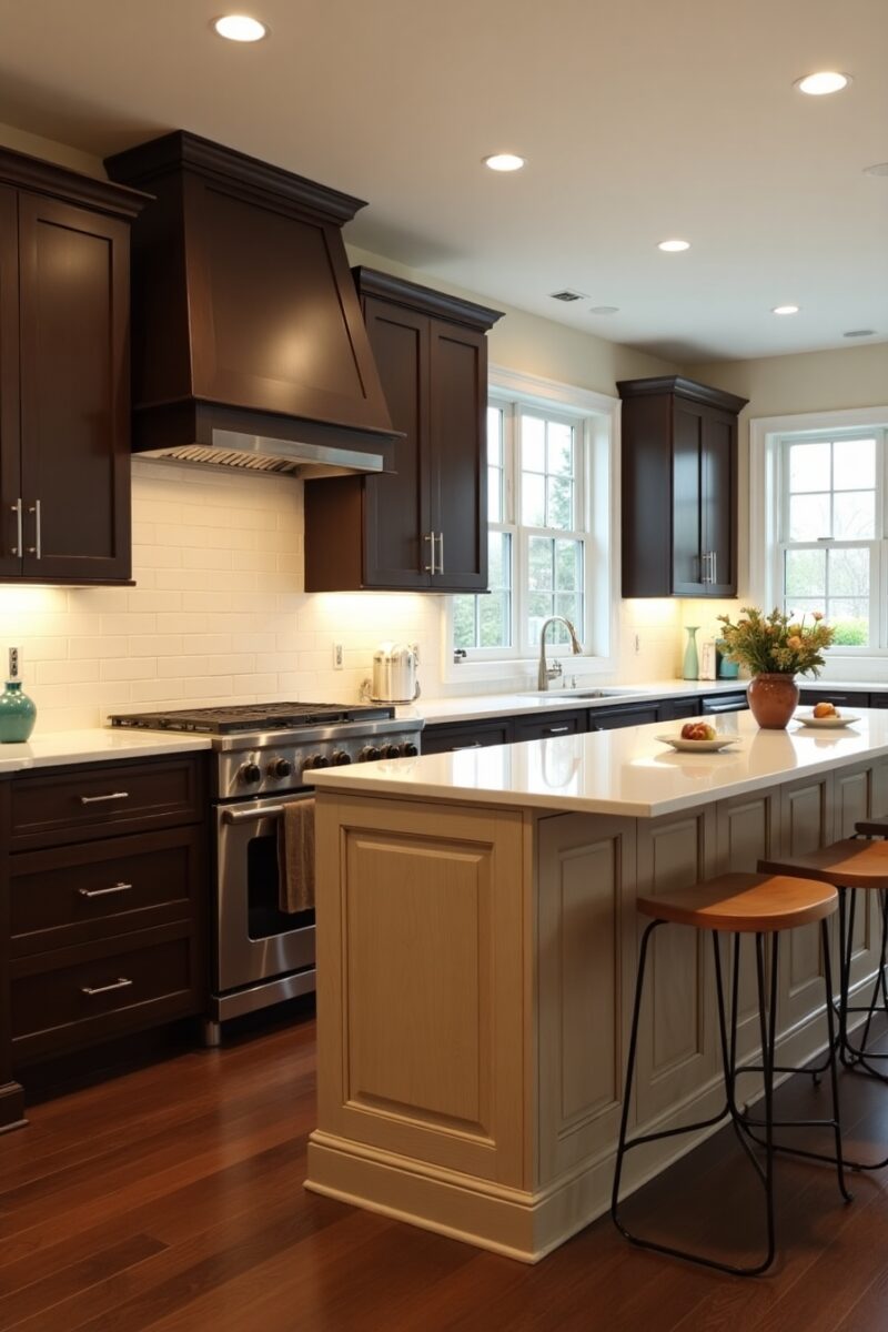 Two-Tone Dark Brown Cabinets with Contrasting Islands