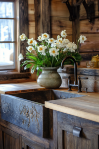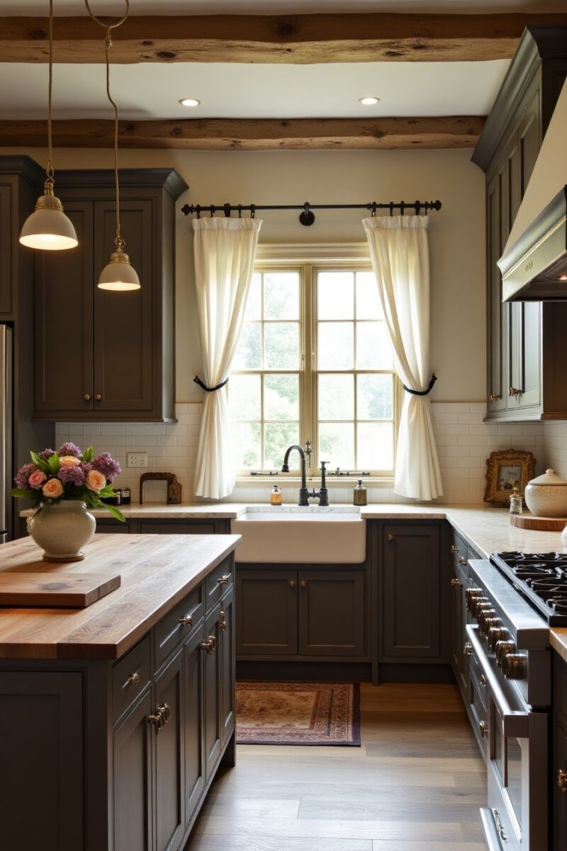 Hardware choices really matter in this style – consider cup pulls and knobs in antique brass or oil-rubbed bronze that look like they’ve been there for generations.