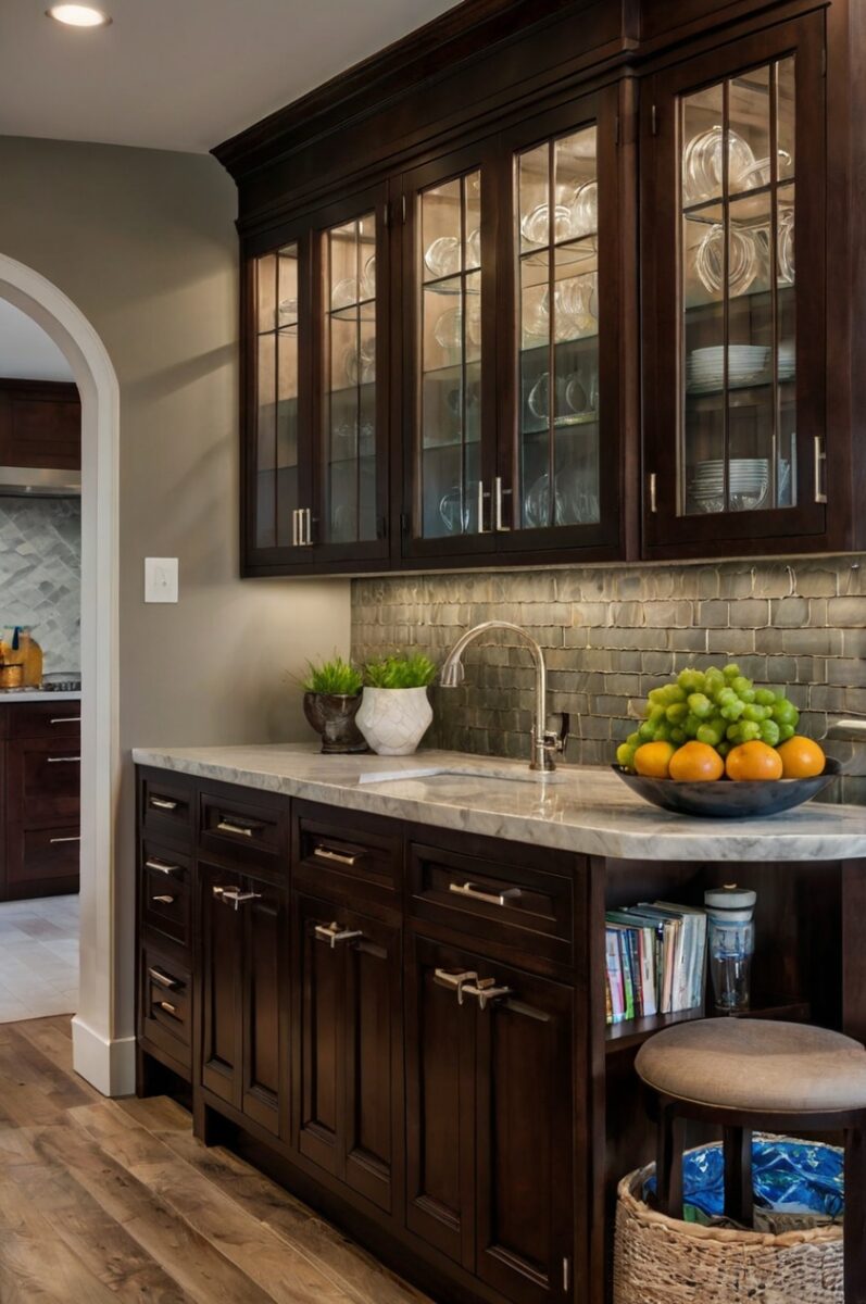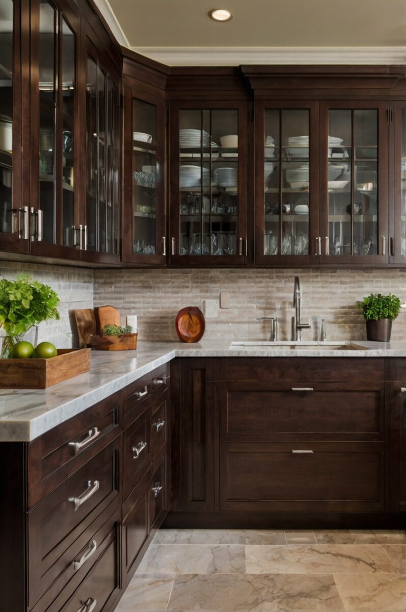 🏡 Start Creating FREE →Transitional Kitchen with Glass-Front Dark Brown Cabinets