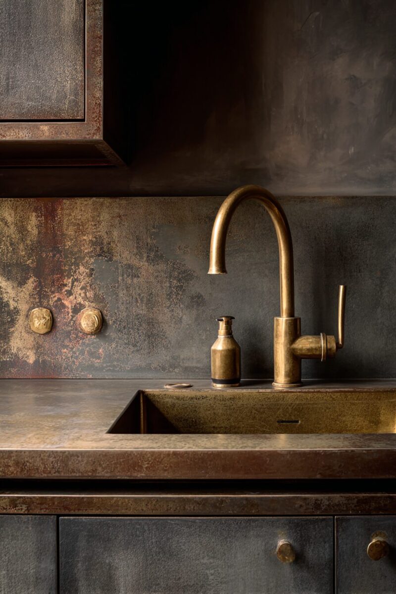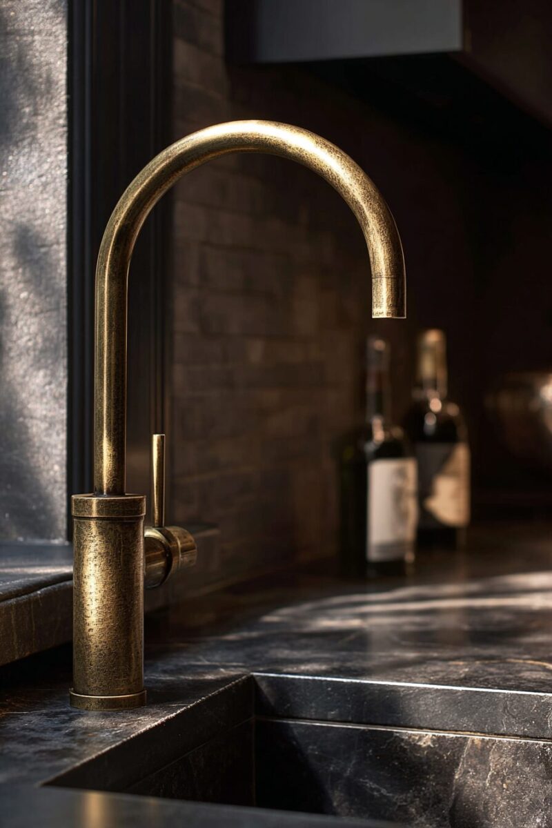 Brass fixtures bring warmth and character to dark cottagecore kitchens, especially when they show signs of natural aging and wear.