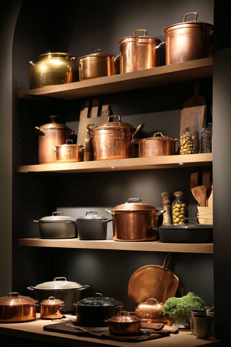 Hang copper pots from a wrought iron rack or display them on open shelving where their warm tones can catch and reflect light.