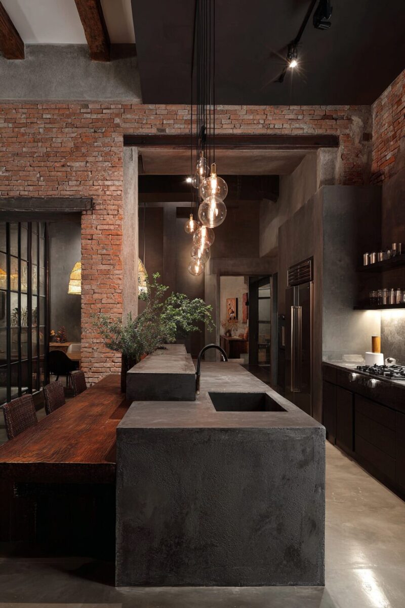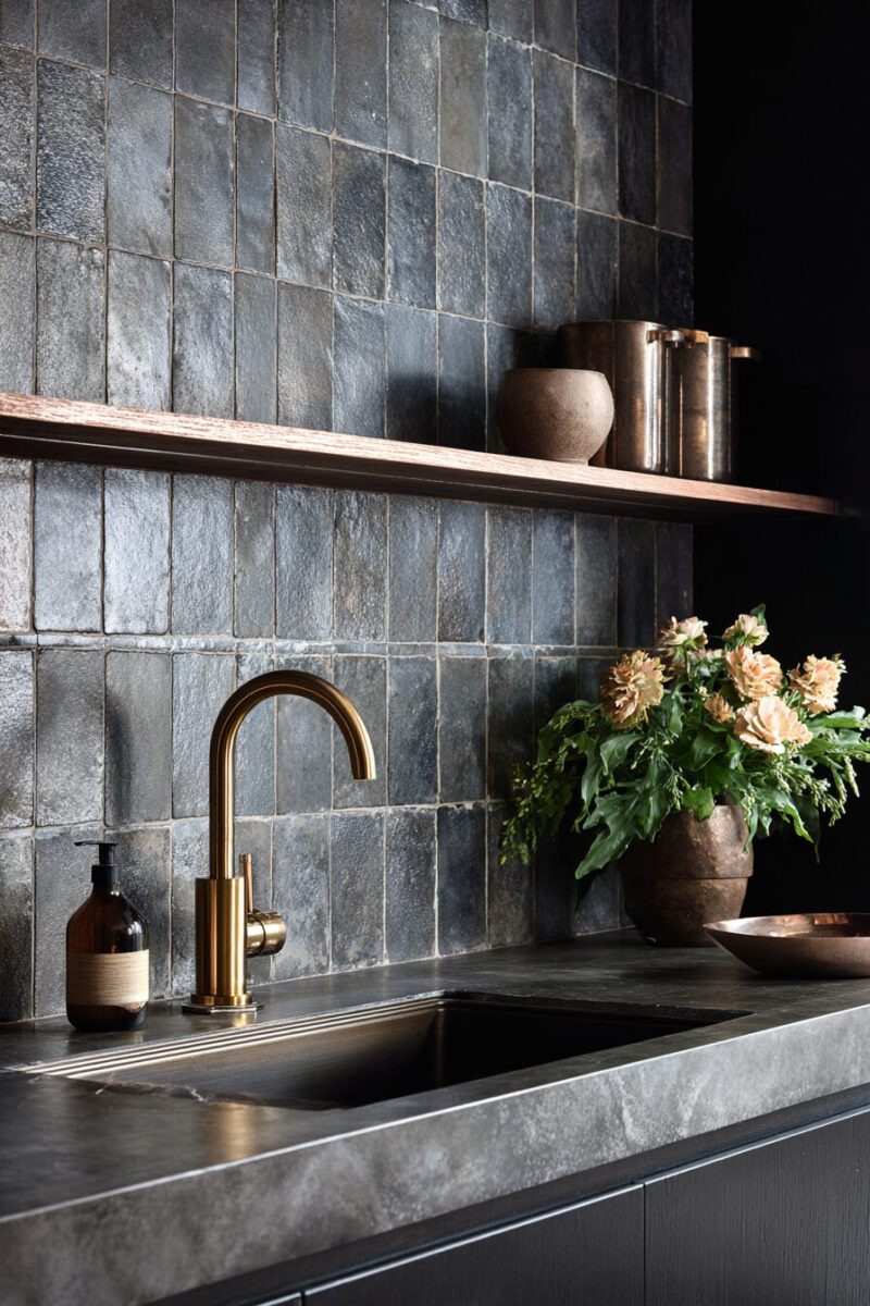 Pair textured walls with smooth surfaces like wooden countertops or painted cabinets to create pleasing contrast and prevent visual overload.