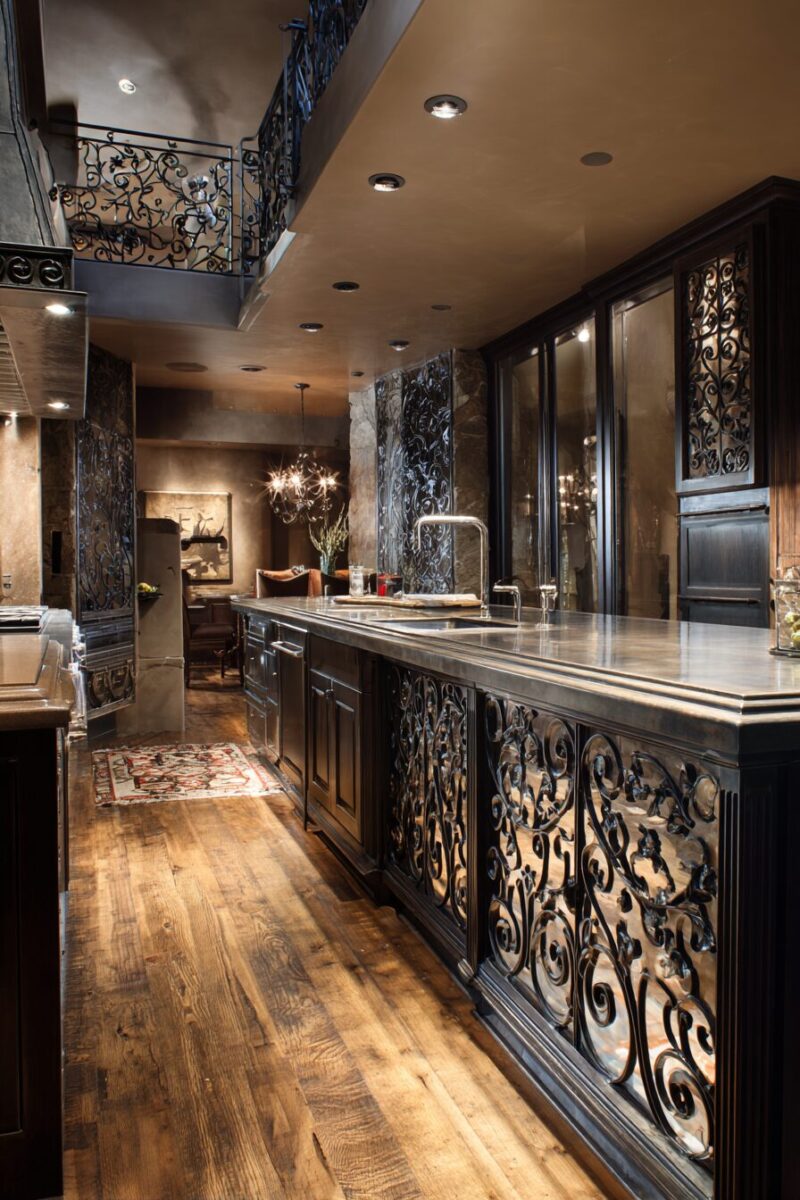 Incorporating wrought iron and blackened metal accents adds architectural interest and authentic period charm to your dark cottagecore kitchen design.