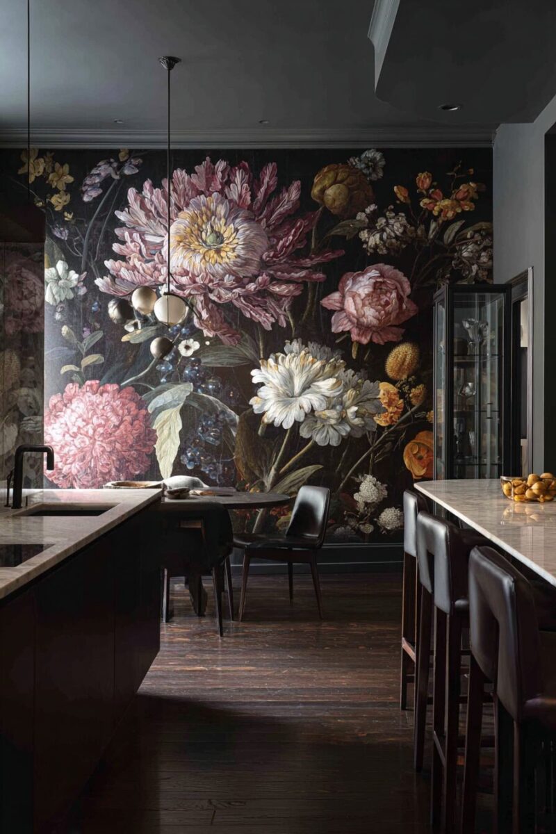 These dramatic botanicals create an intimate atmosphere that makes your kitchen feel like a hidden cottage tucked away in an enchanted forest.