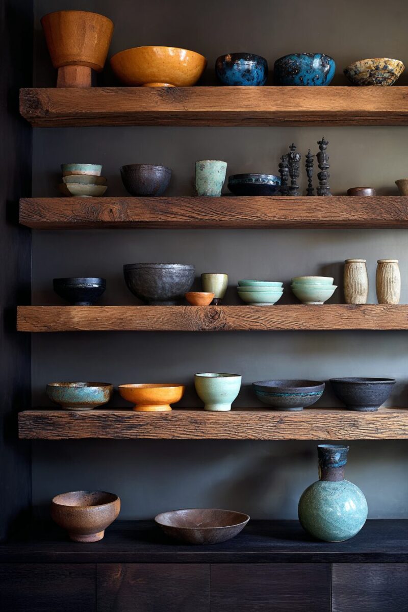 Open shelving made from reclaimed or dark-stained wood provides the perfect stage for showcasing your collection of vintage ceramics and pottery.