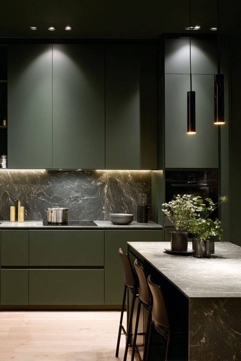Pair dark lower cabinets with lighter upper cabinets or open shelving to maintain visual balance and prevent the space from feeling heavy.