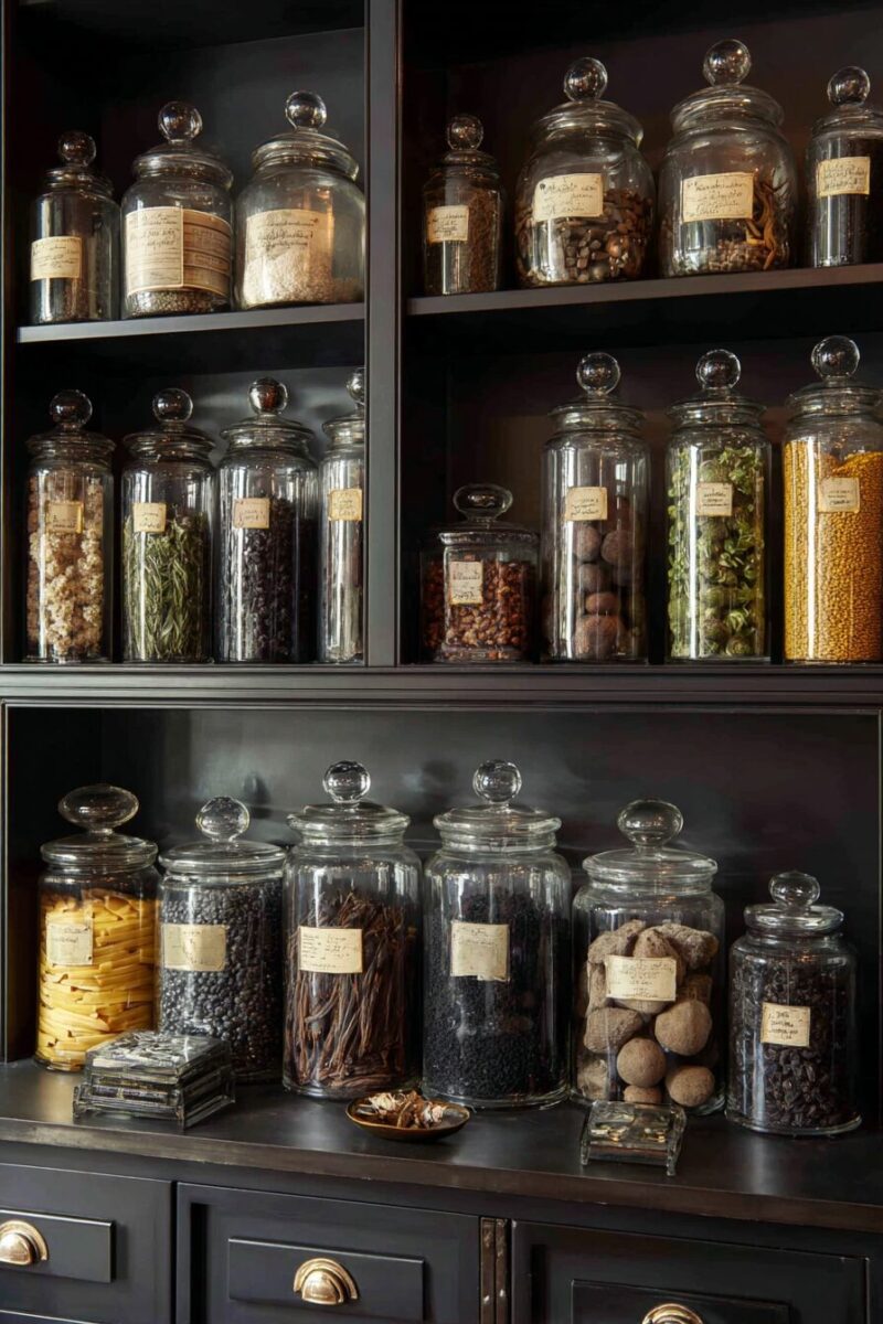 Old-fashioned apothecary jars with ground glass stoppers or cork tops add authentic vintage charm while providing airtight storage for flour, sugar, and spices.