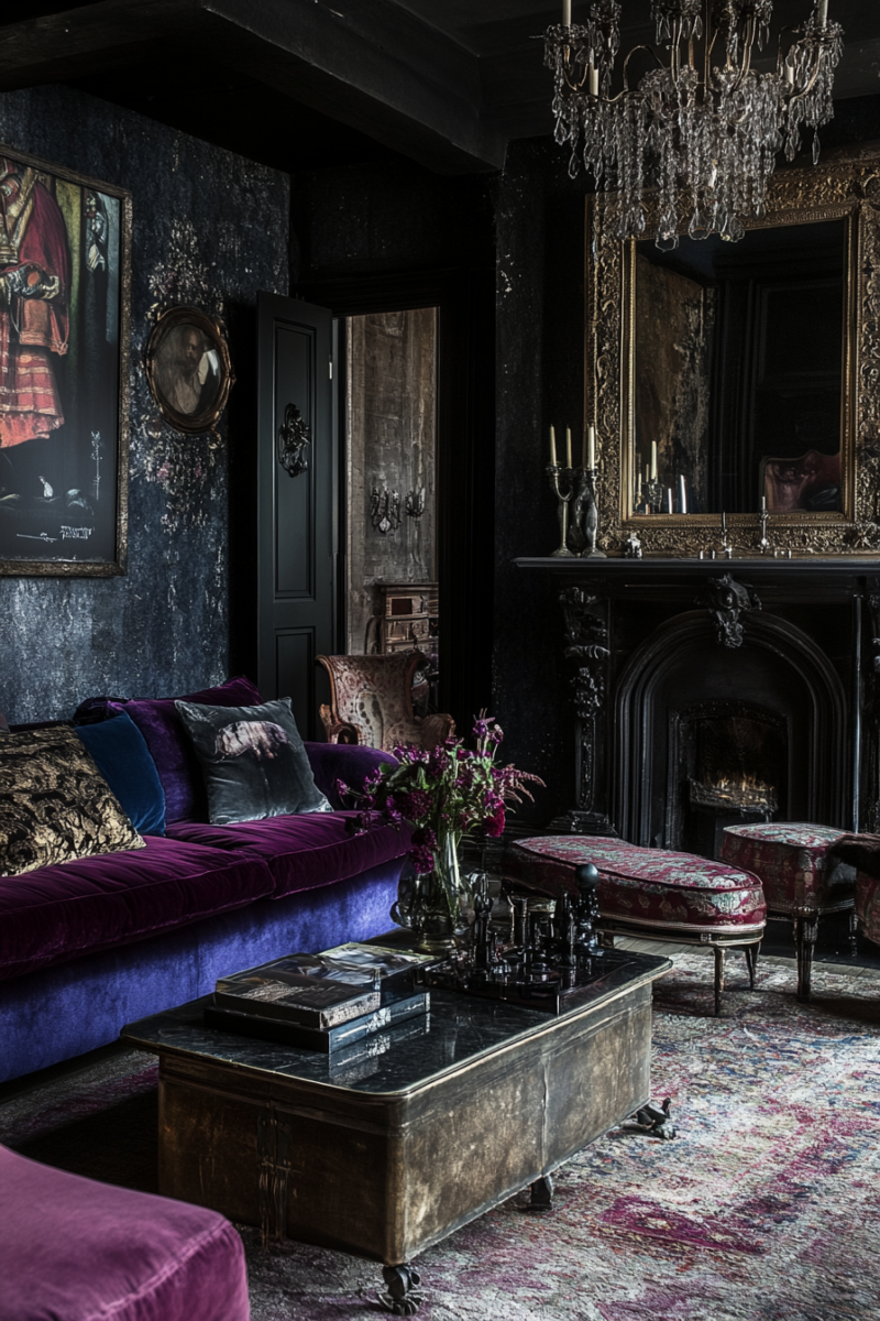 Gothic-inspired decor immediately sets the dark maximalism mood.