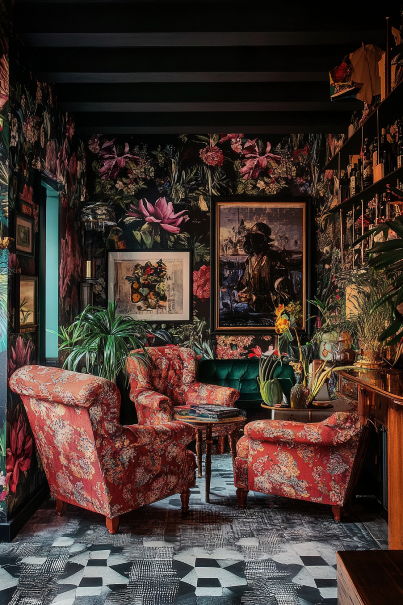While dark maximalism revels in moody hues, bold botanical prints provide a lively pop of contrast.