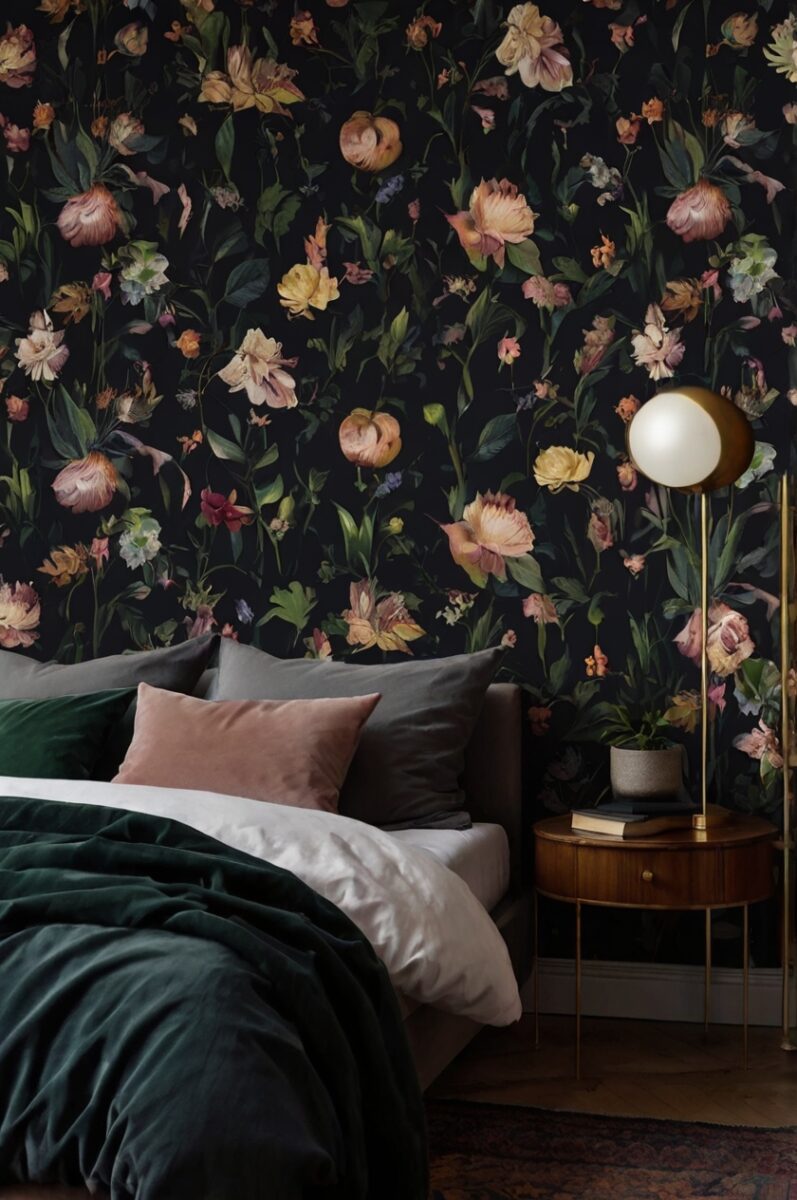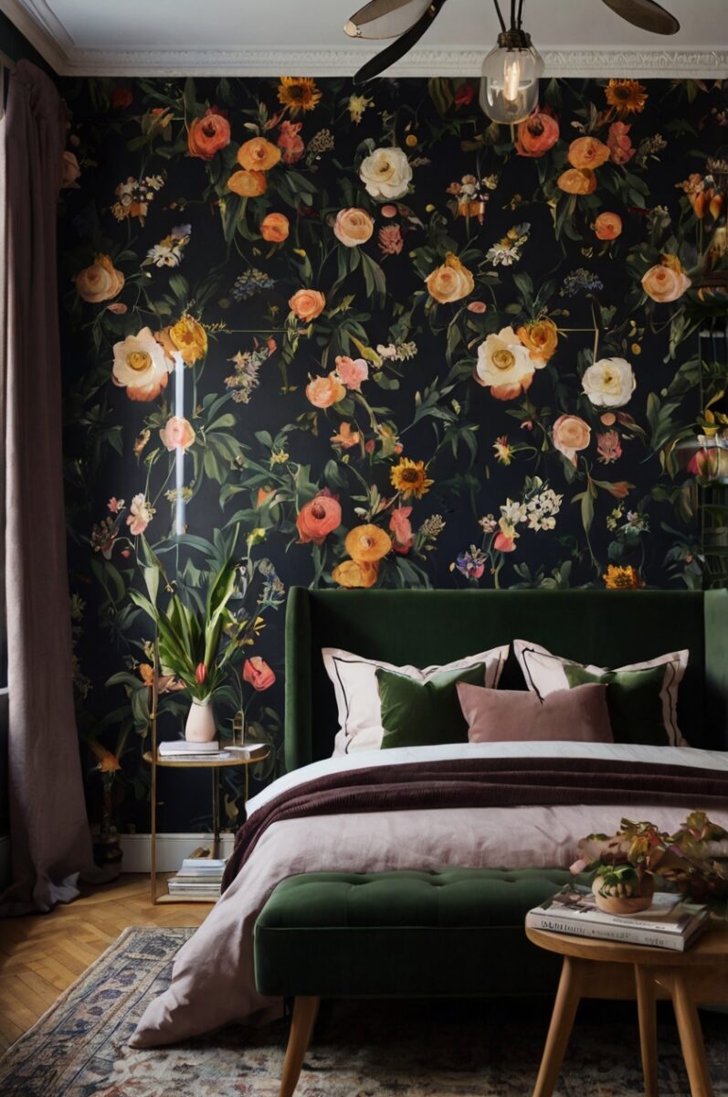Large-scale floral patterns create dramatic focal walls behind your headboard, while smaller prints work beautifully in reading nooks or study areas.
