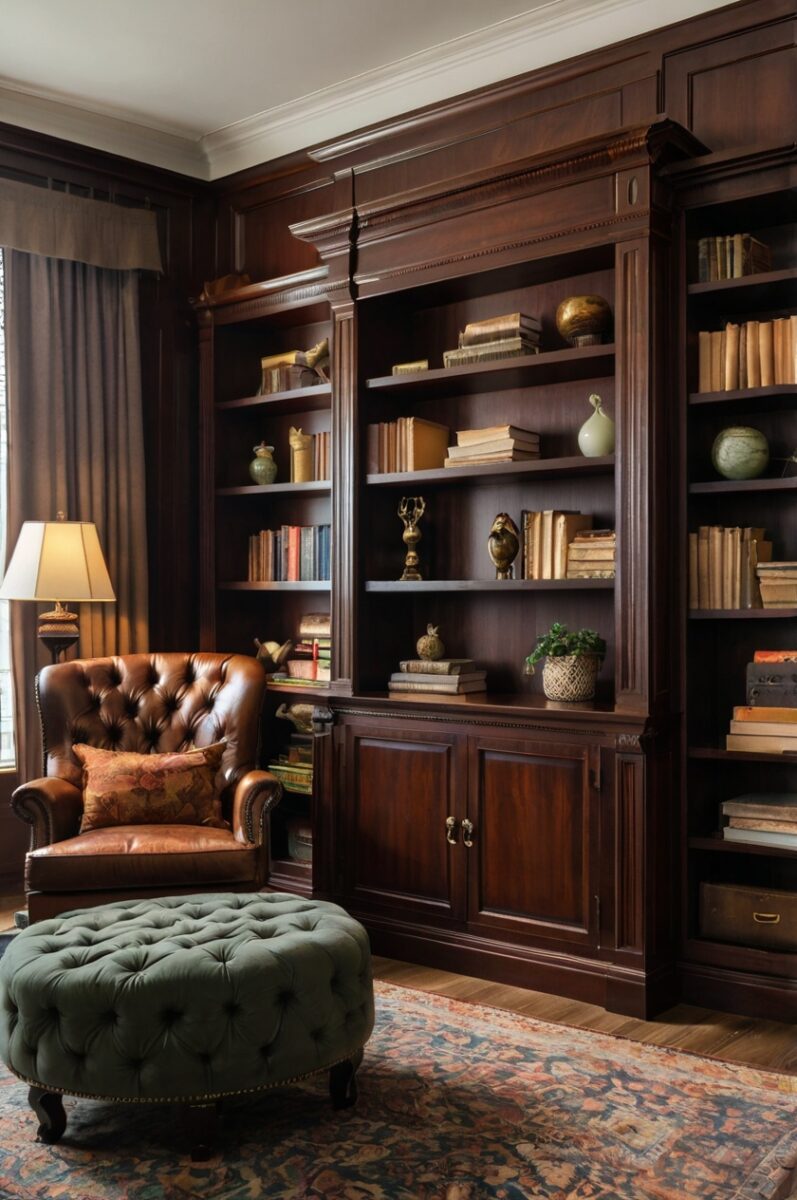 Rich Mahogany Bookshelves with Vintage Leather Accents