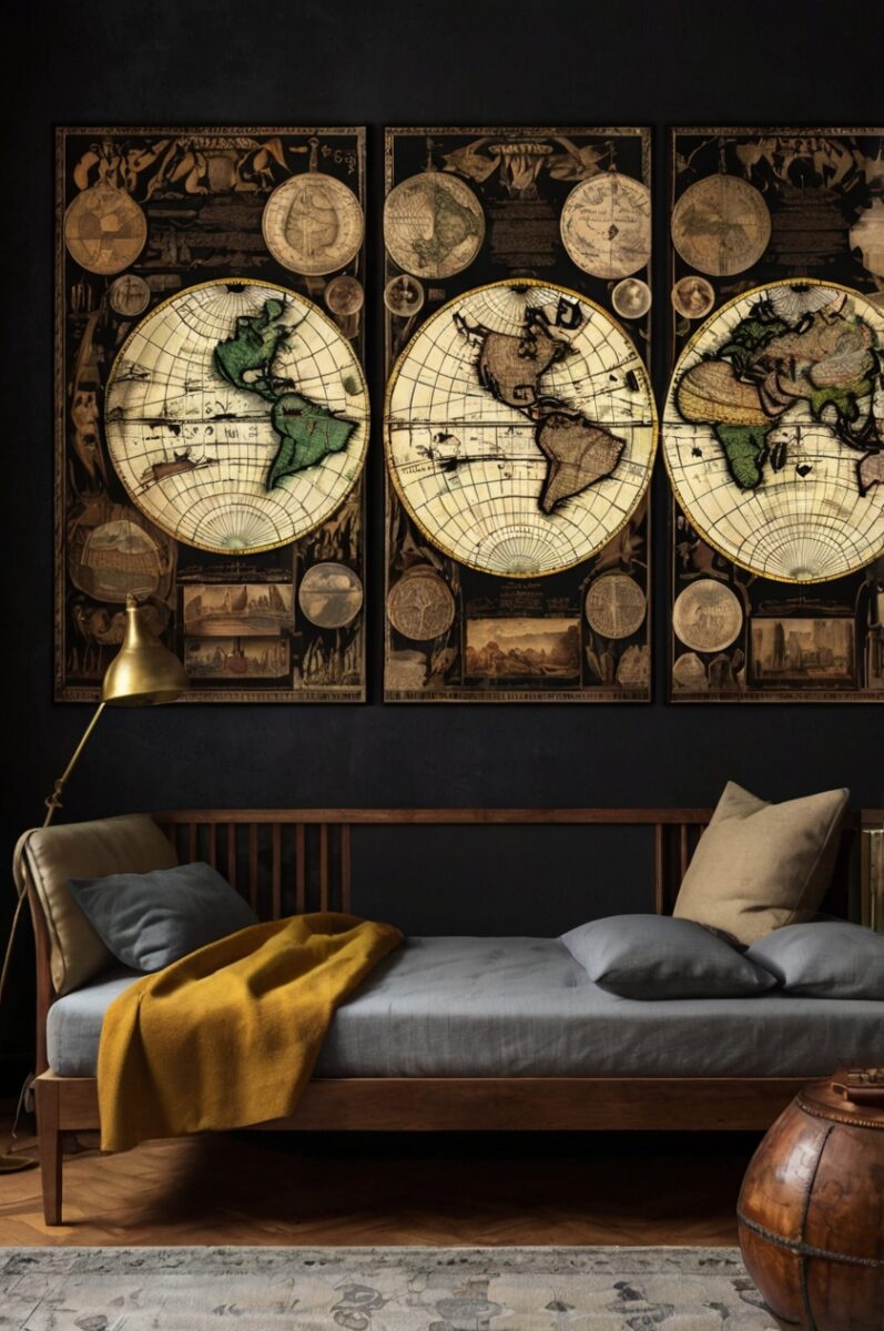 Large-scale vintage world maps serve as stunning focal points that instantly transport you to an era of exploration and intellectual curiosity.