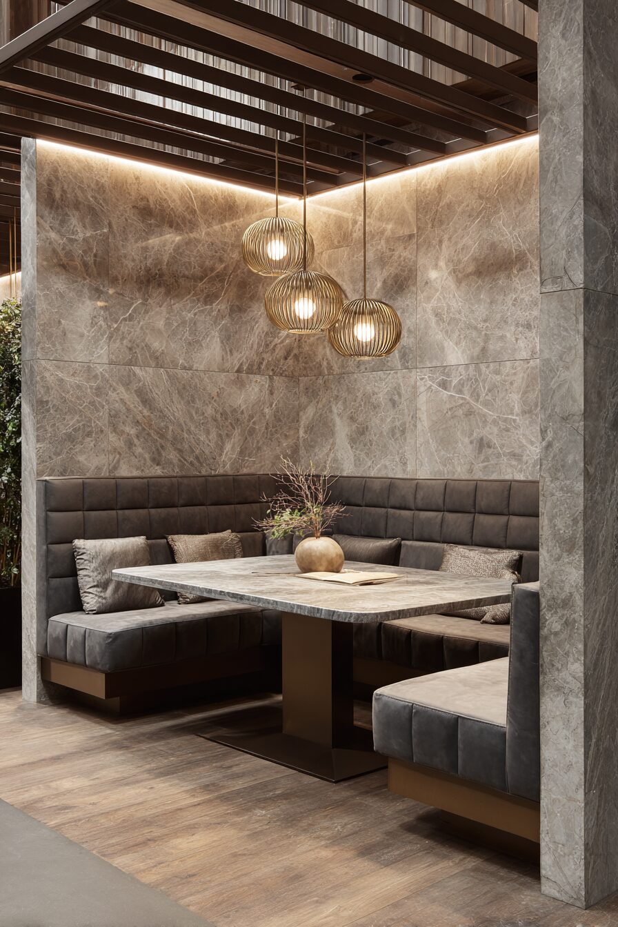 Create an intimate dining experience with booth seating featuring extra-high backs that provide privacy and sound absorption.