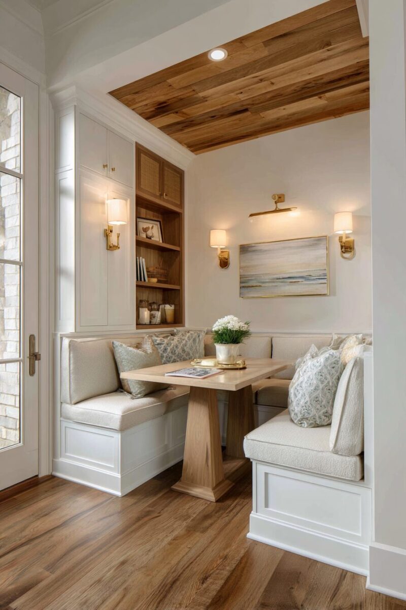 Add built-in storage beneath the window seat for items like table linens, candles, or reading materials.