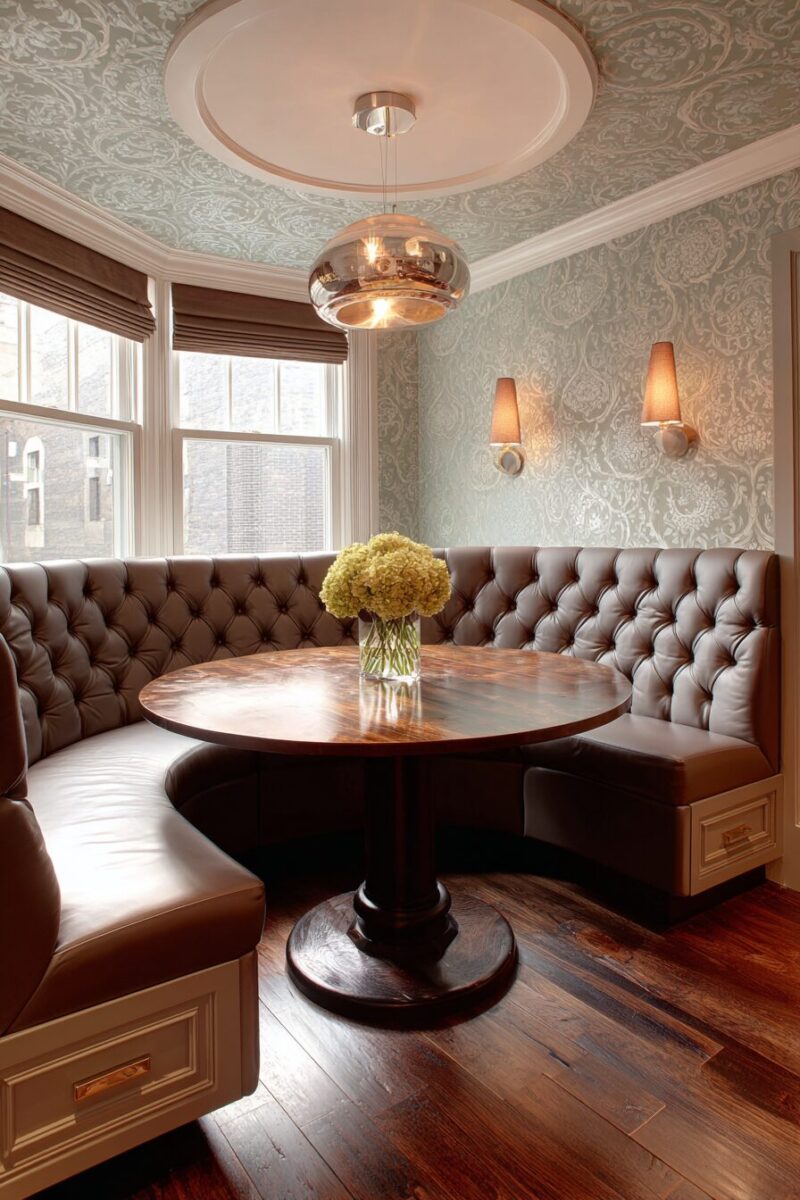 Banquette seating hugs the wall while the curved design follows the table’s shape, creating a cocoon-like feeling of intimacy.