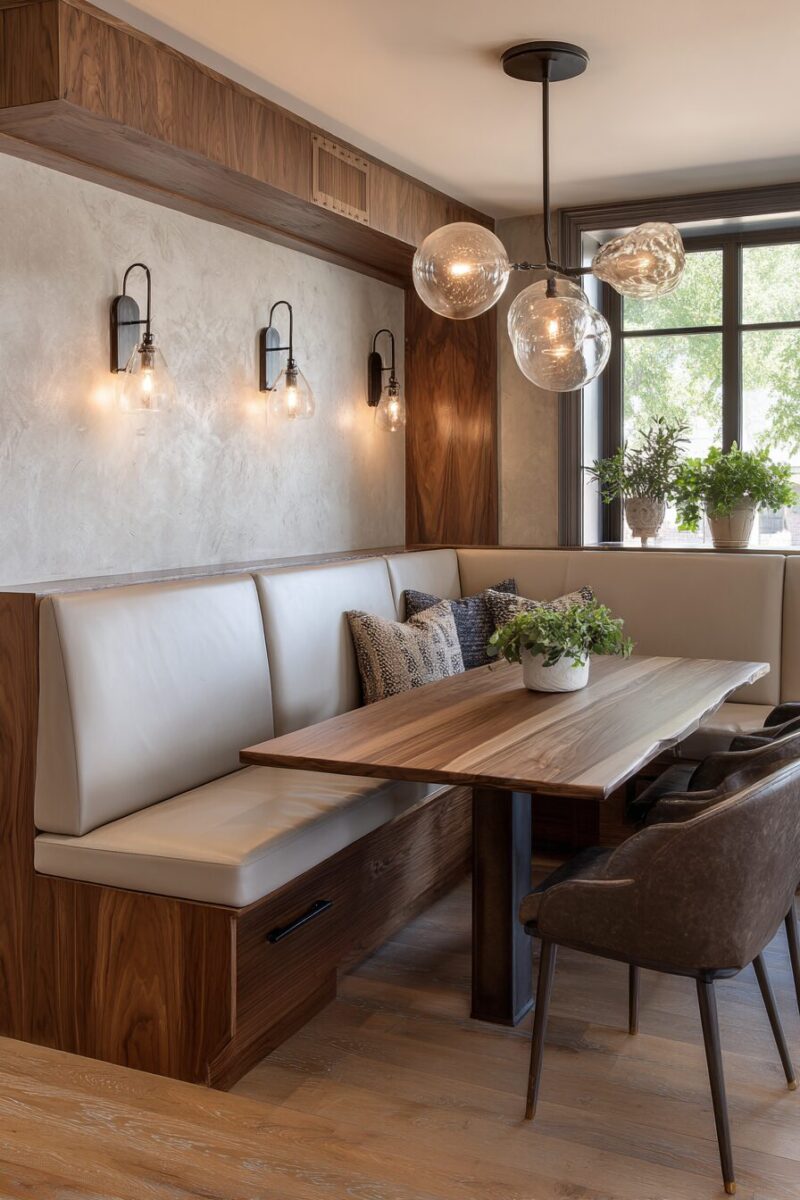 The space between the banquette back and the wall can accommodate artwork, floating shelves, or decorative elements.