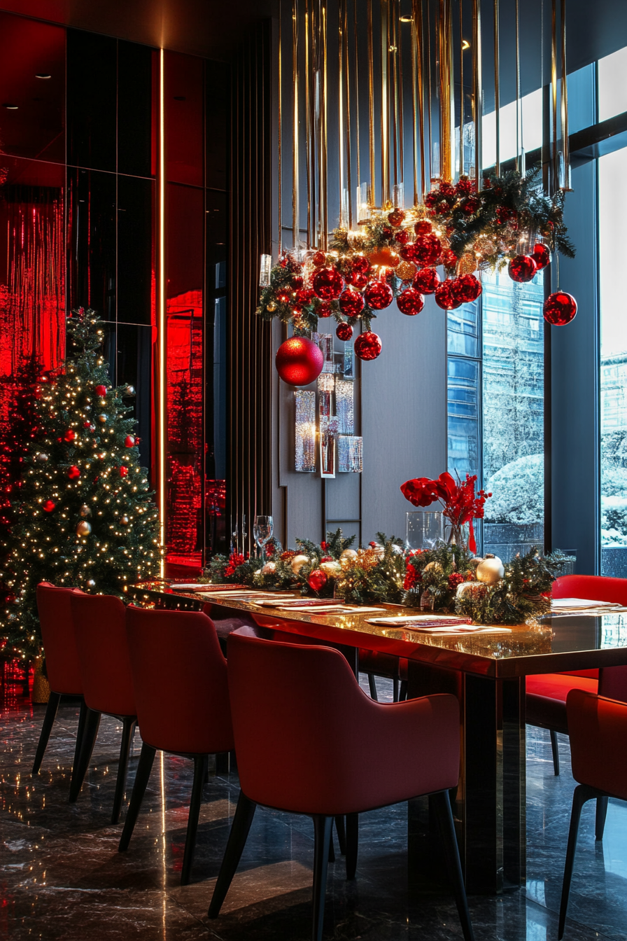 One festive dining room decorating idea I adore is decking out your space with shiny silver and gold ornaments and accessories for an elegant, glamorous Christmas vibe.