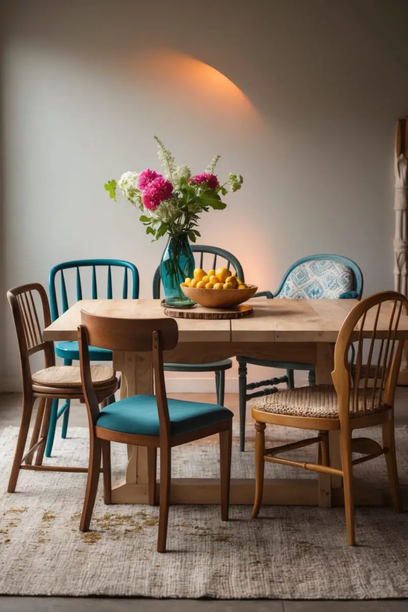 Using two different styles of chairs makes a great statement, with interesting arm chairs at the head of the dining table or happily patterned wingbacks.