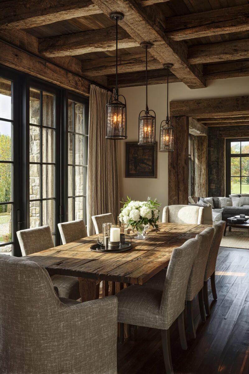 Farmhouse-style light fixtures bring warmth and character that makes your dining room feel like the heart of a country home.
